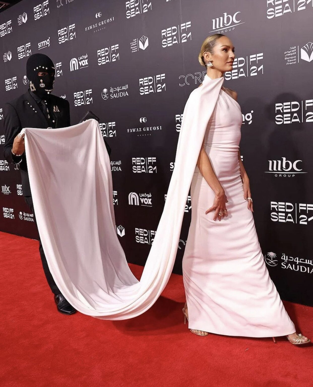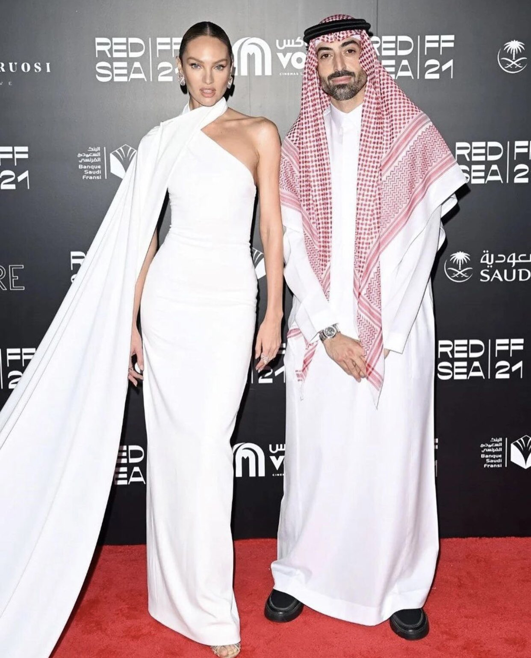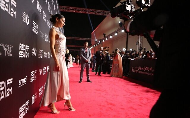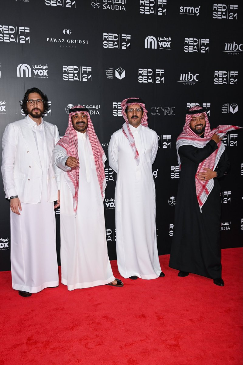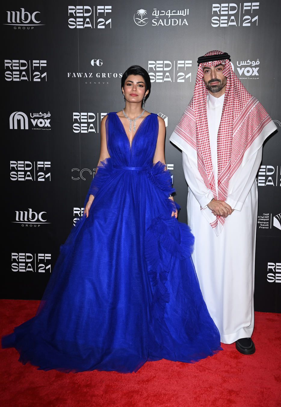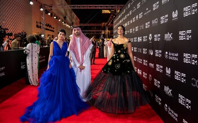 محمد التركي رئيس المهرجان يتوسط الممثلتين السعوديتين ميلا الزهراني وفيئ فؤاد